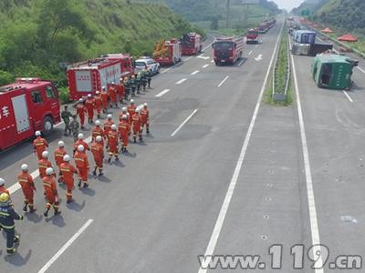 為切實推動“迎接十九大奮戰(zhàn)一百天忠誠保平安”消防專項行動縱深開展,做好各類災(zāi)害事故滅火救援準(zhǔn)備工作,進(jìn)一步提升戰(zhàn)區(qū)部隊聯(lián)合協(xié)同作戰(zhàn)能力,以優(yōu)異成績迎接黨的十九大勝利召開,9月21日,廣西消防總隊在包茂高速梧州支線開展全區(qū)高速公路交通事故救援跨區(qū)域綜合演練。共調(diào)集梧州、玉林、貴港3個消防支隊共18輛消防車108名官兵,梧州市應(yīng)急辦、交警、醫(yī)療、通信、路政等應(yīng)急聯(lián)動部門7車45人參加此次演練。